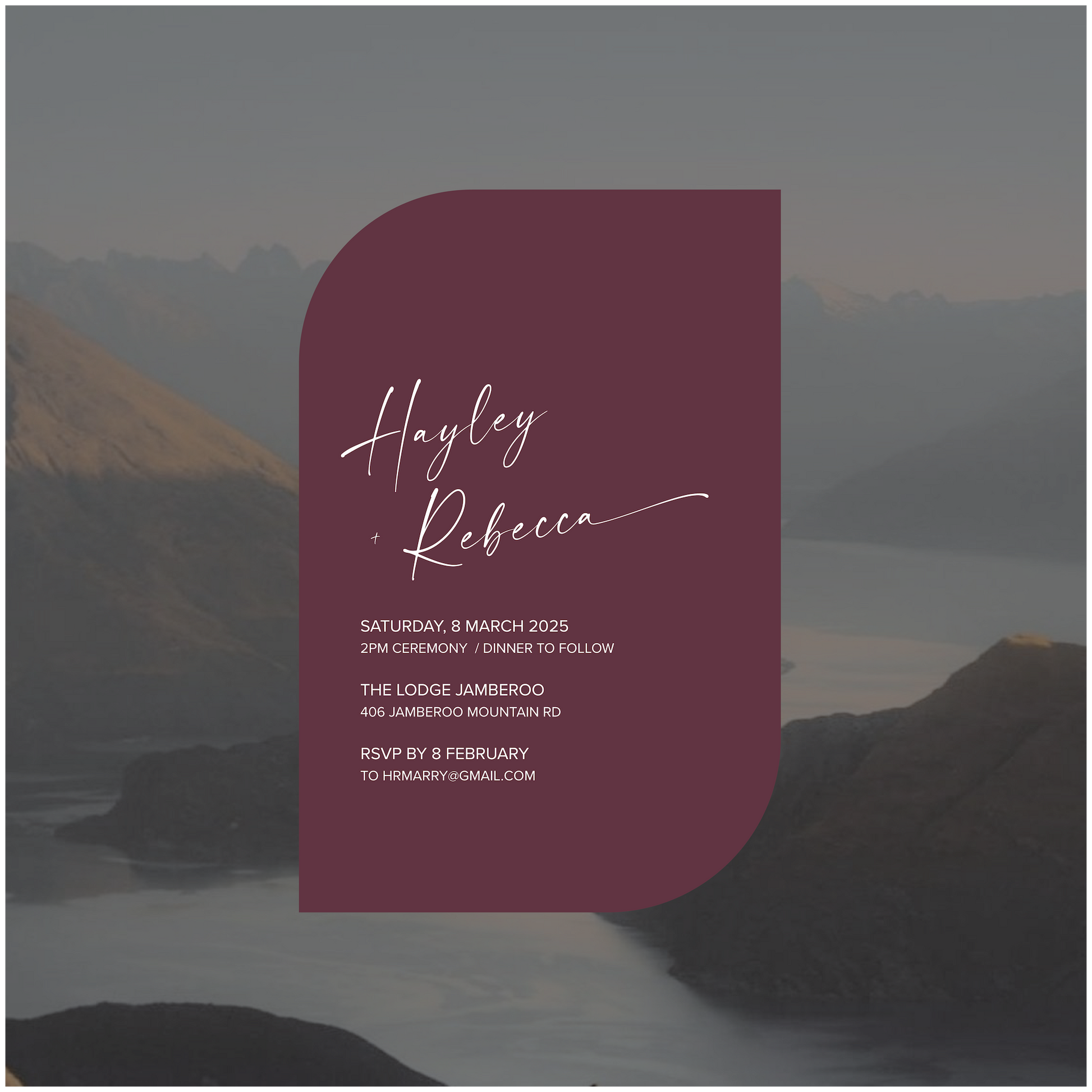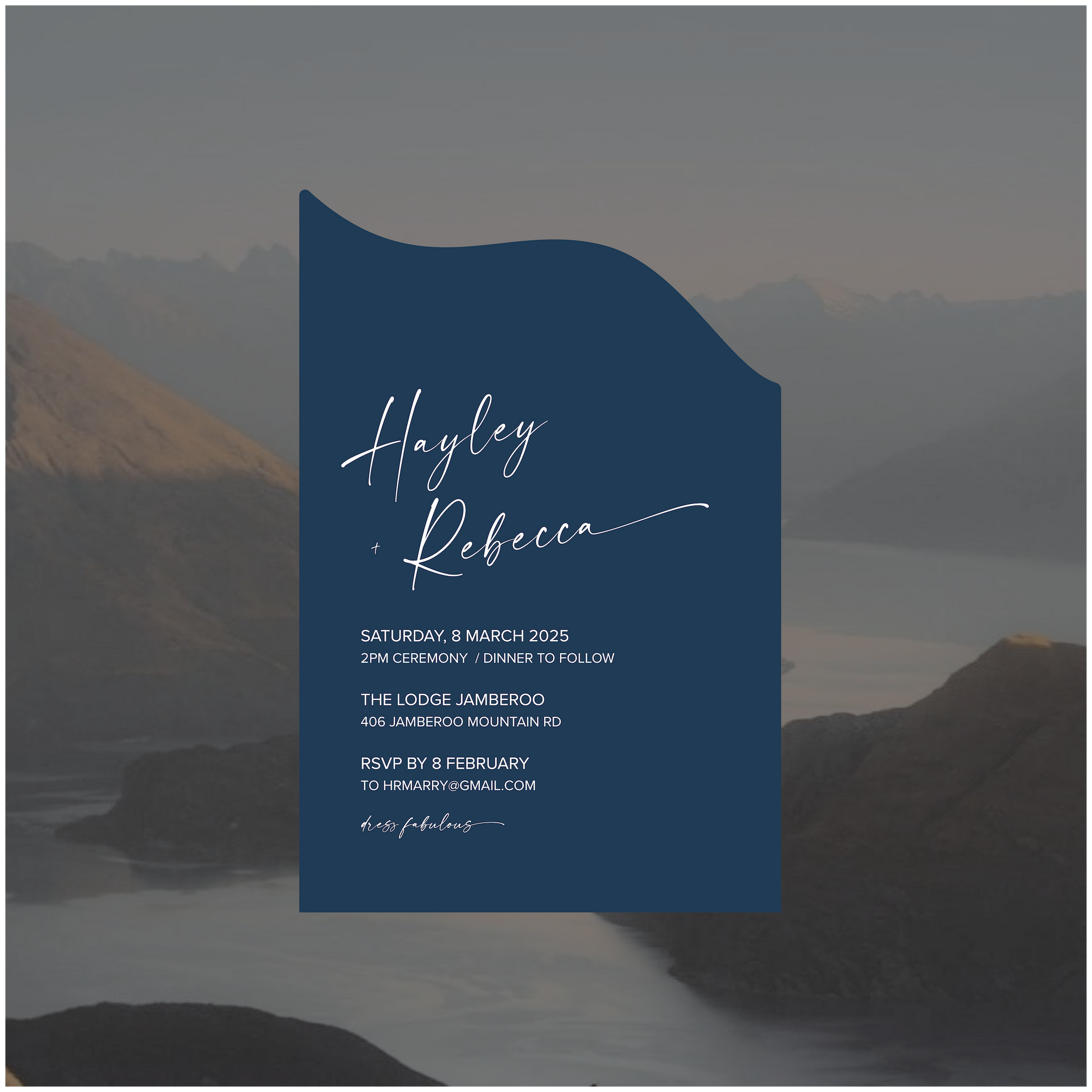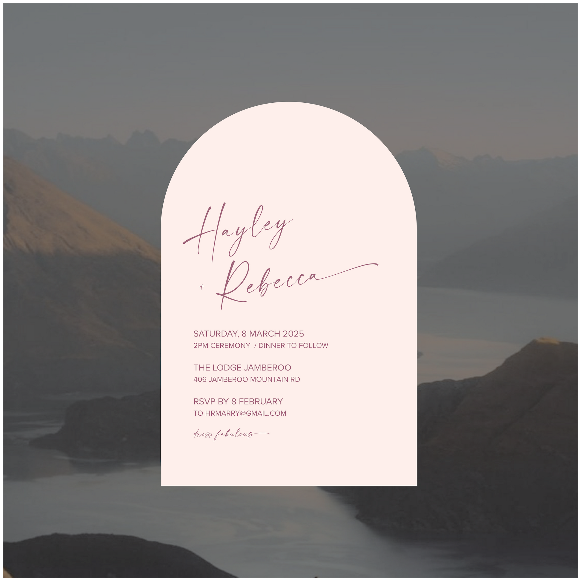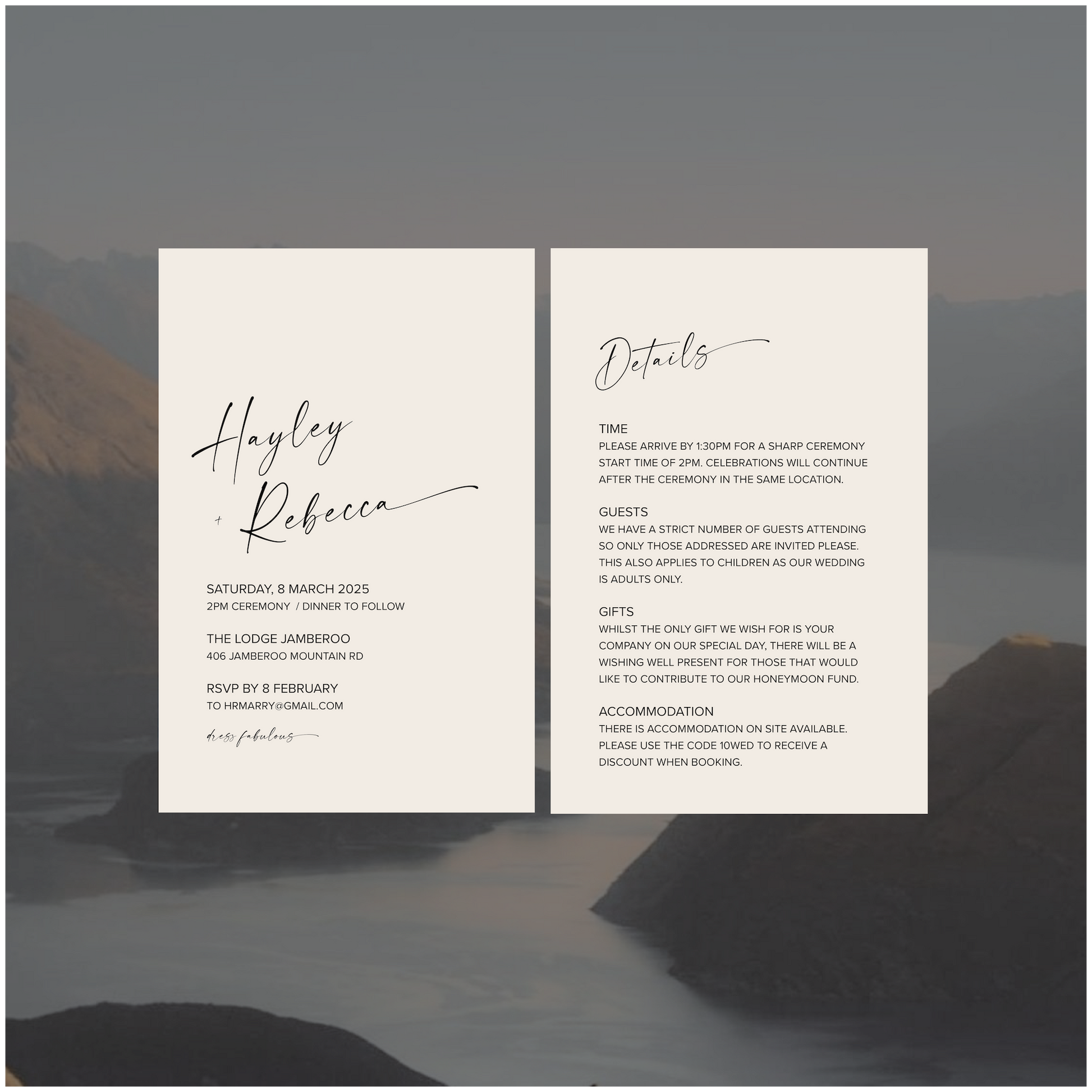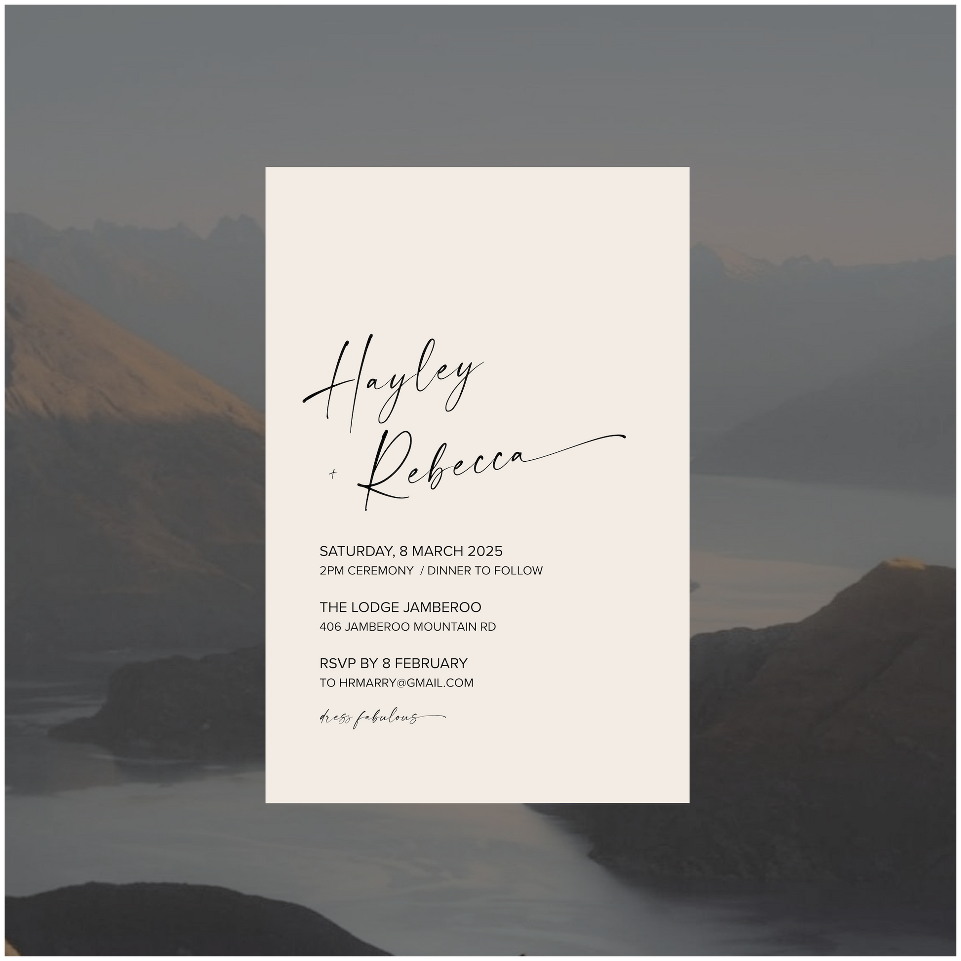 Part of the New Zealand Collection, this single piece wedding invite is perfectly paired back for those modern lovers looking for something simple, classic and romantic.