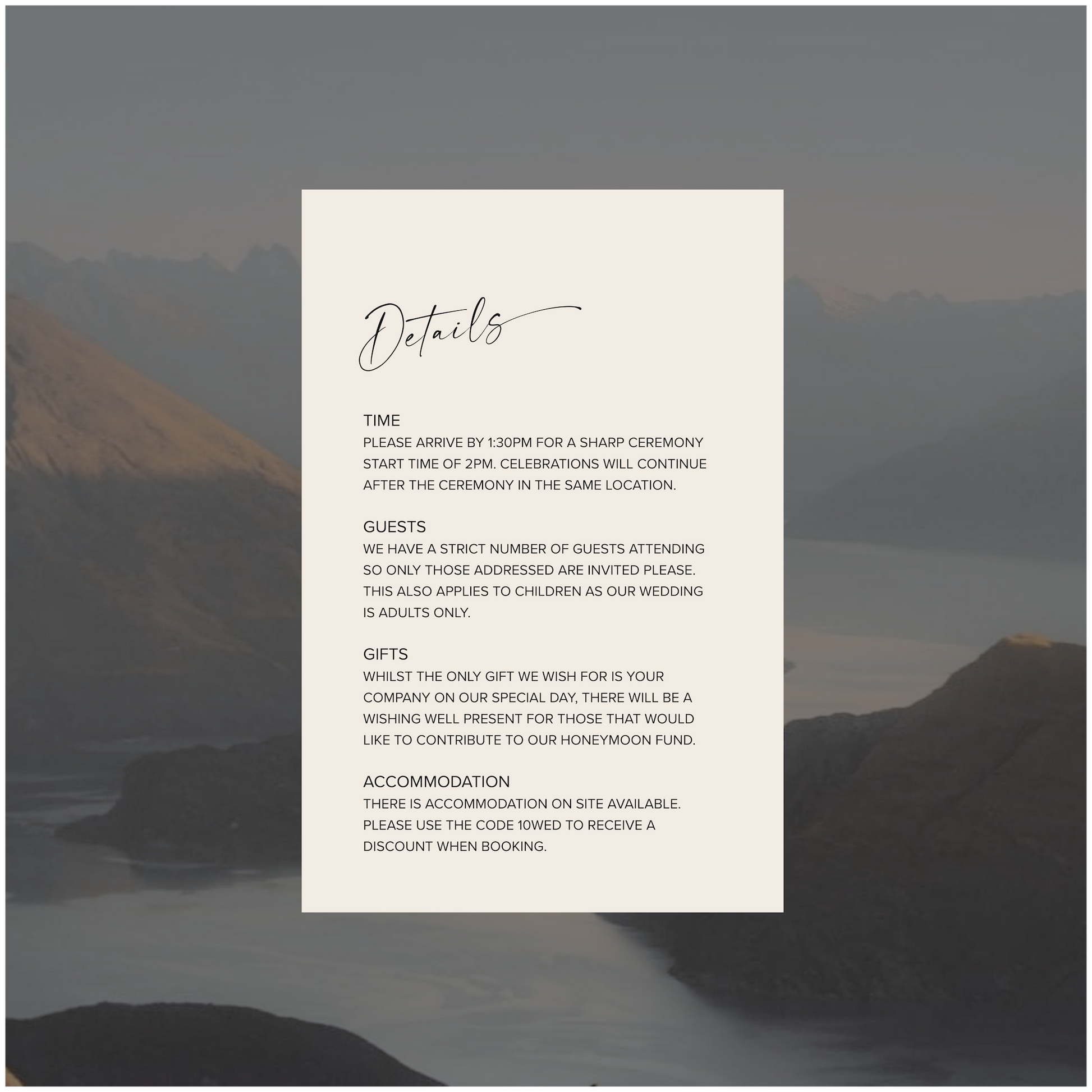 • We always recommend ordering extra invites for those 'maybe' guests, keepsakes and photography details on the day.