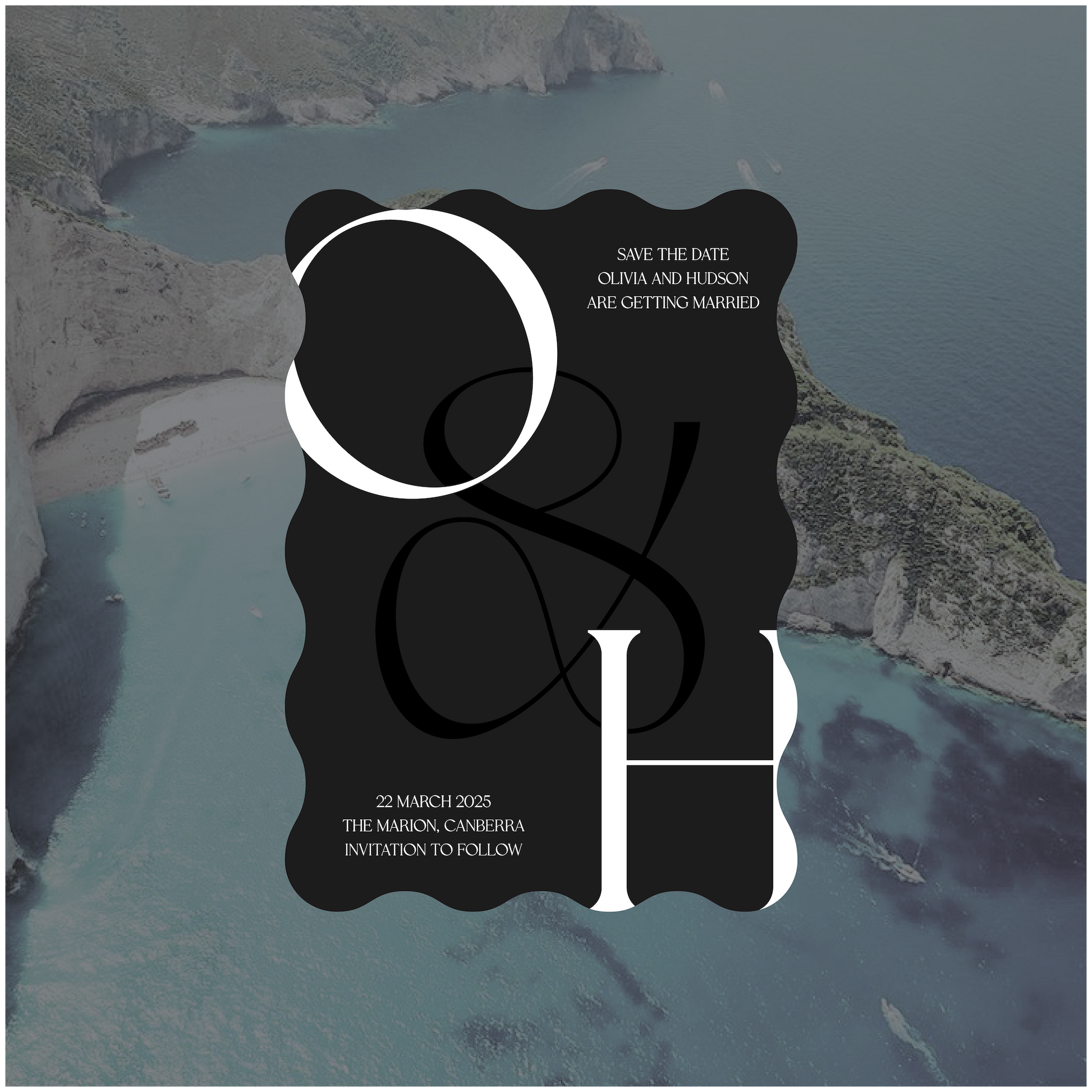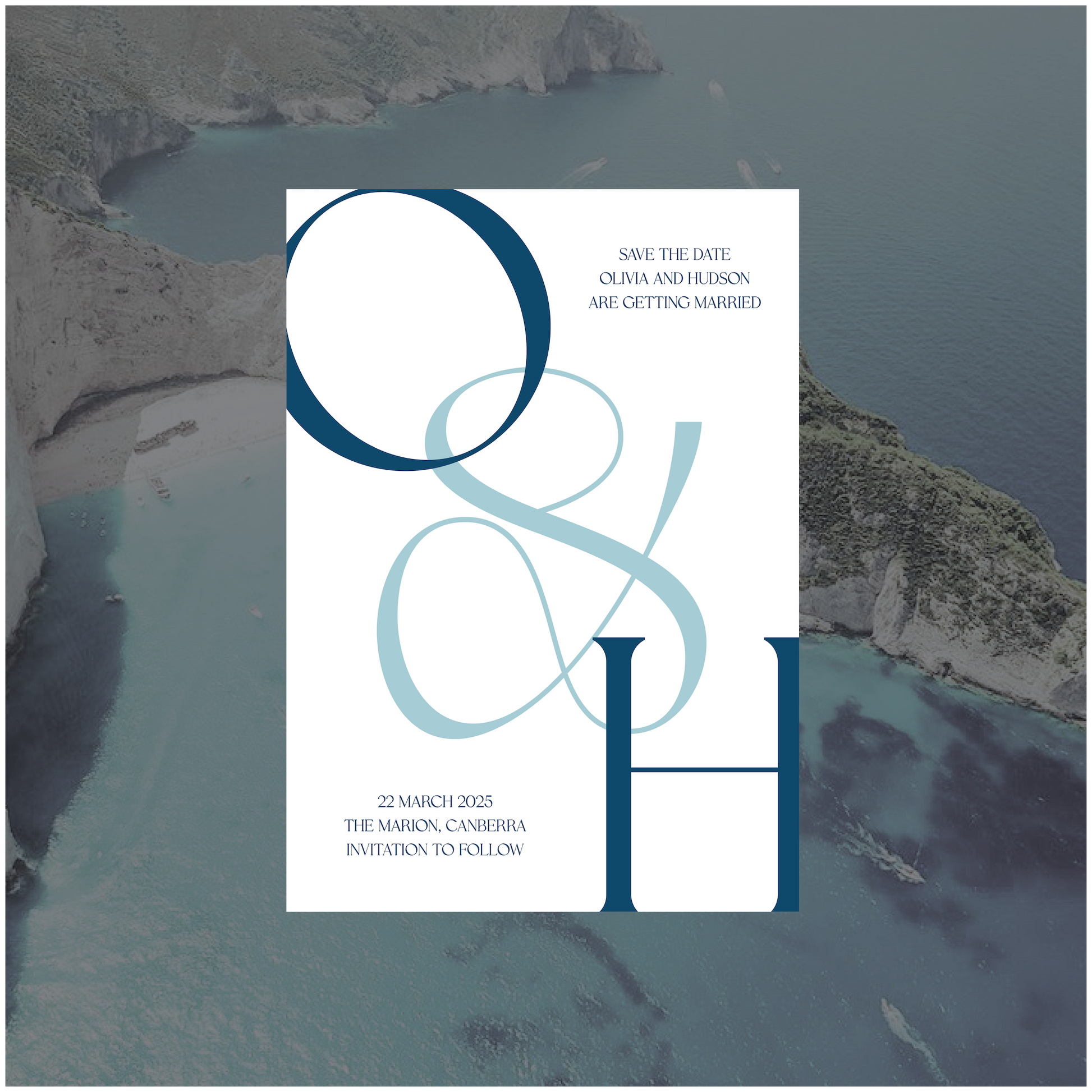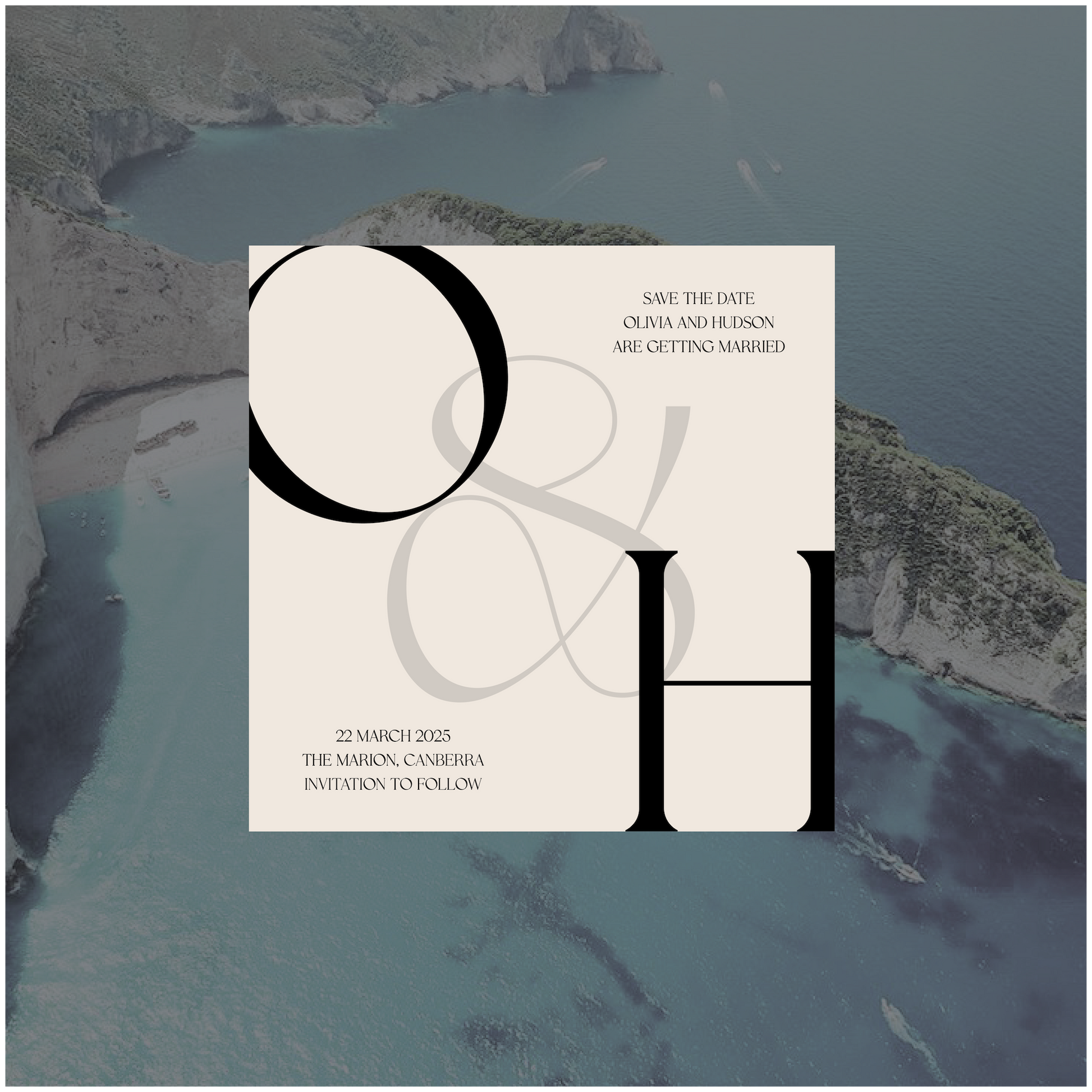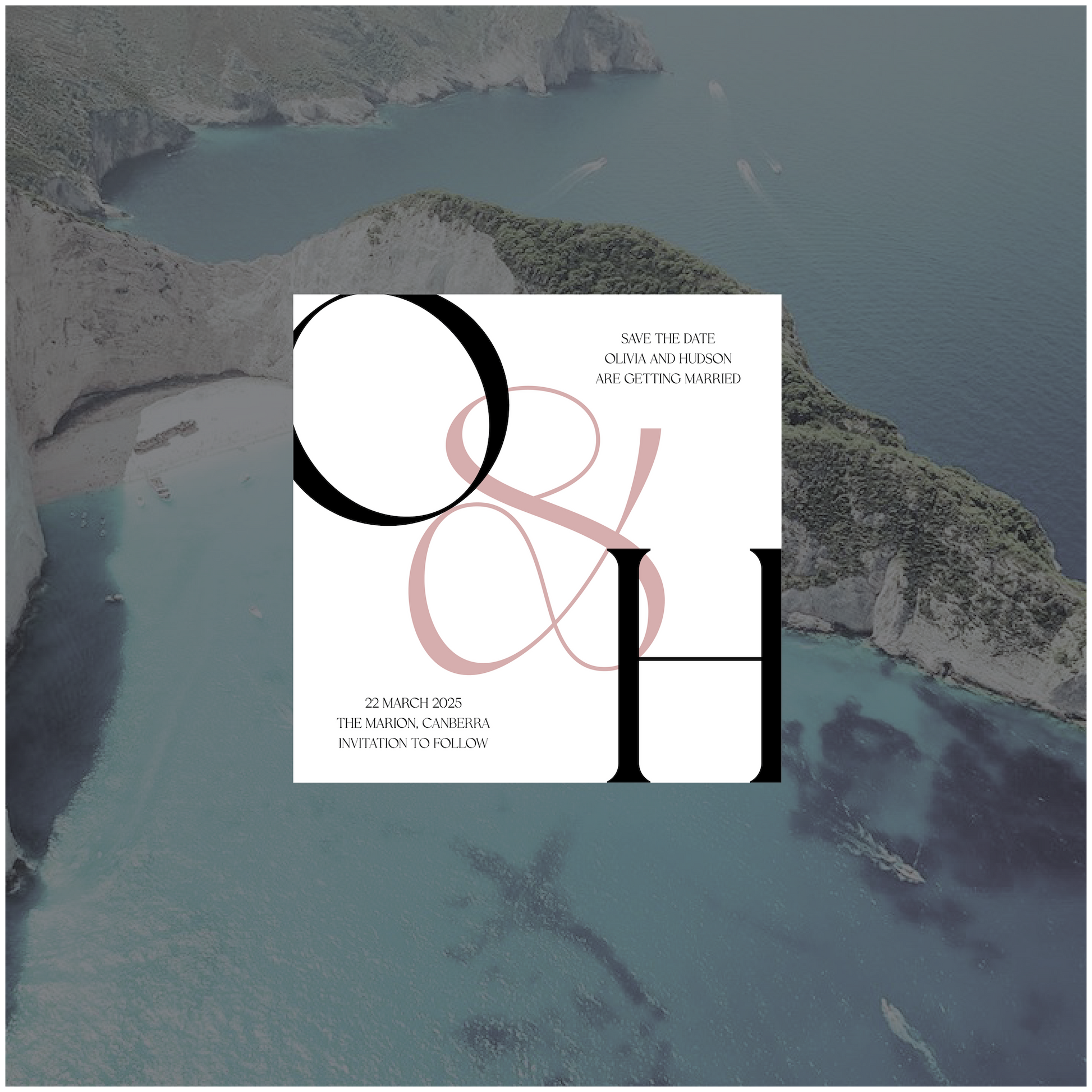 Part of the Greece Collection, this save the date wedding invite features bold initial graphics with your details nestled around the curves of text making for a striking, modern invite to get your guests chatting early about your epic day.