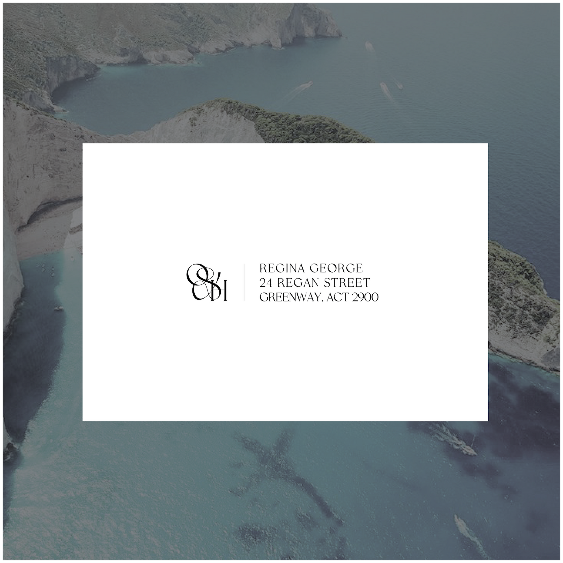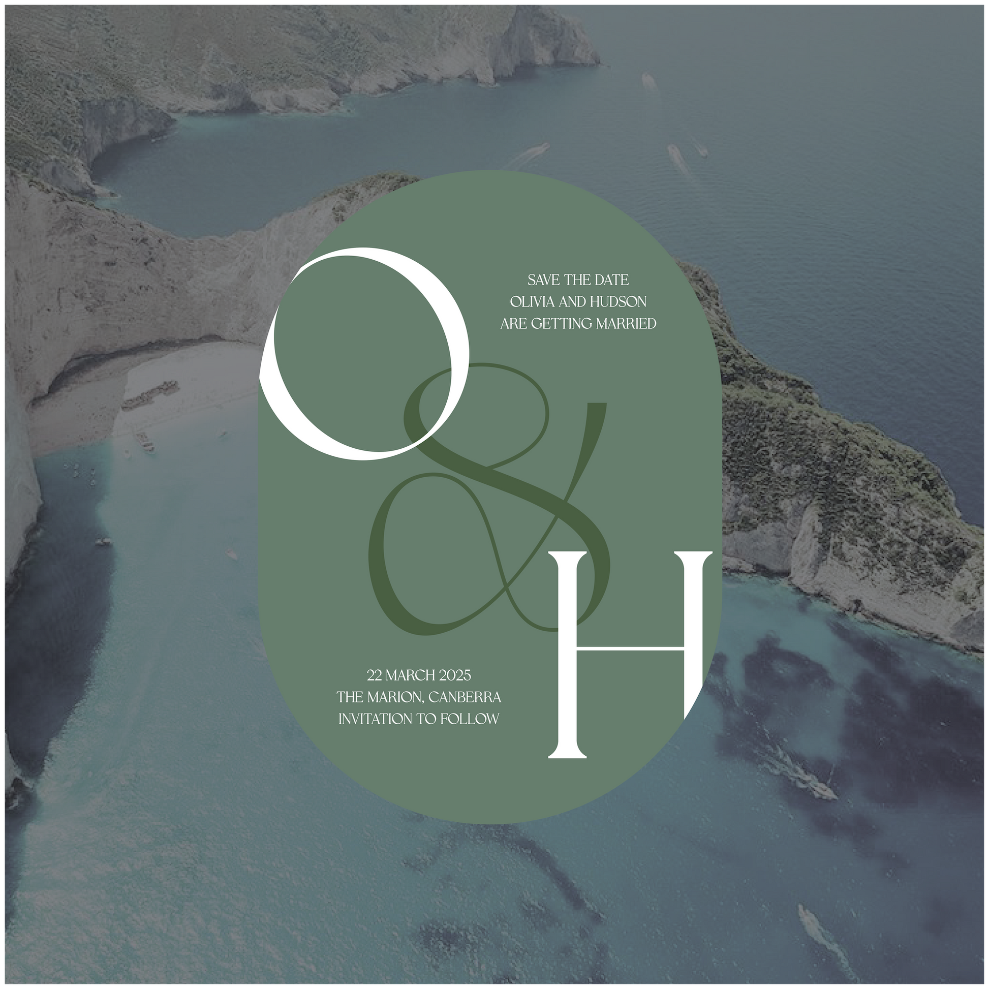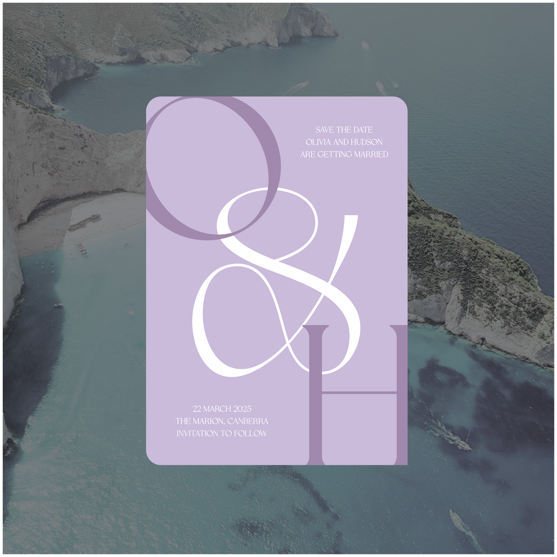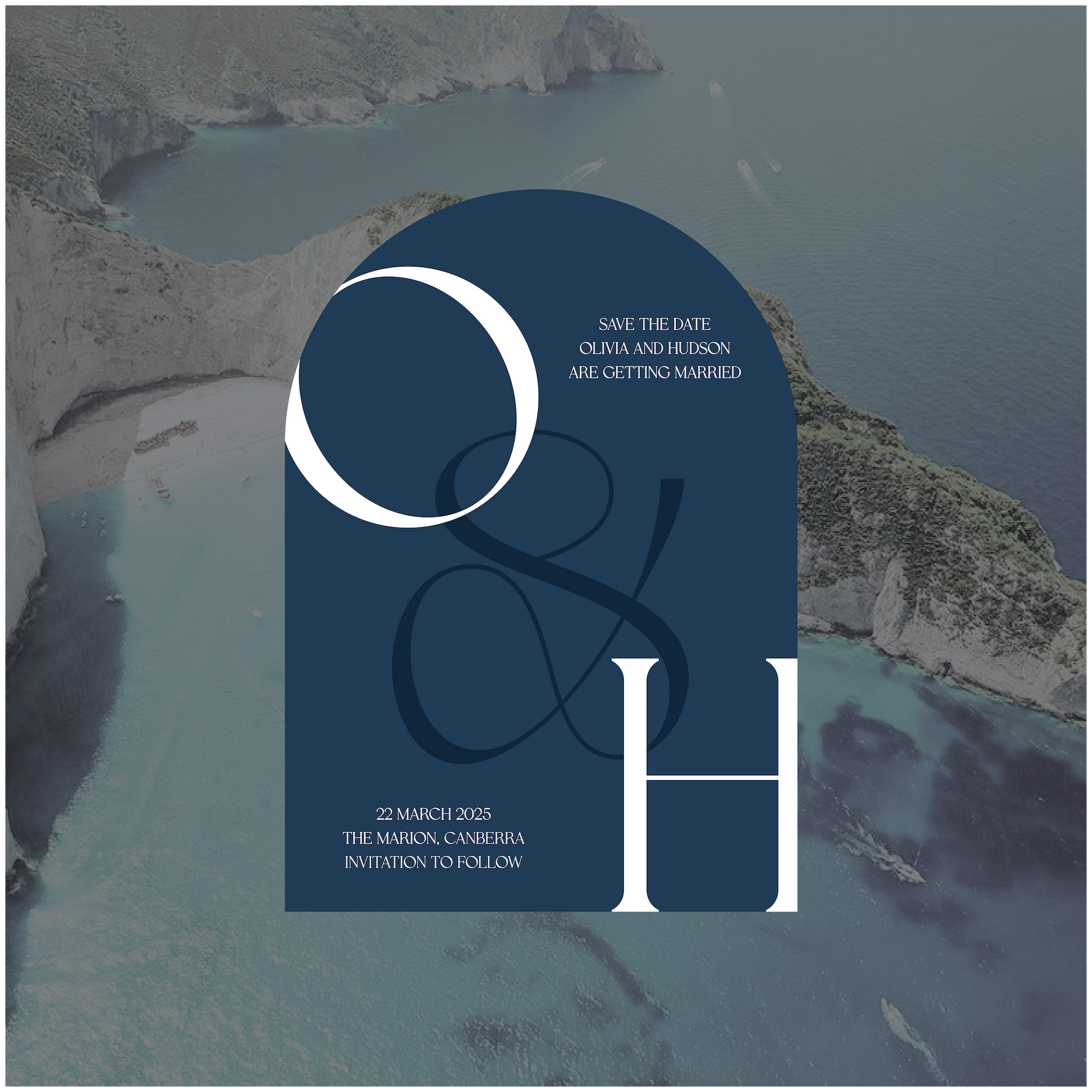 Part of the Greece Collection, this save the date wedding invite features bold initial graphics with your details nestled around the curves of text making for a striking, modern invite to get your guests chatting early about your epic day.